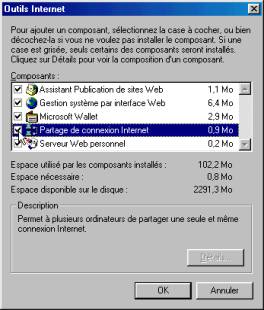 A partir du Panneau de configuration, double-cliquer sur "Ajout/Suppression de programmes". Dans l’onglet "Installation de Windows", sélectionner "Outils Internet" puis cliquer sur le bouton "Détails…". Cocher la case "Partage de connexion Internet" puis cliquer deux fois sur OK. Le CD-Rom de Windows 98 peut être demandé.