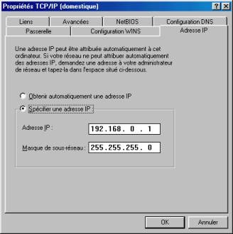 Tous les autres onglets doivent être laissés à leurs valeurs par défaut (ainsi que les paramètres des deux autres protocoles TCP/IP). On notera au passage que la classe d'adresse employée limite le nombre de clients possible aux adresses comprises entre 192.168.0.2 et 192.168.0.253.