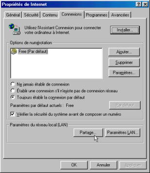 • Dans les propriétés d'Internet, onglet "Connexion", cliquer sur le bouton "Partager"