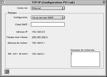 A partir du menu "Pomme", aller dans "Tableau de bord" puis cliquer sur "TCP/IP". Configurez une connexion par le réseau local (Ethernet dans cet exemple) et une configuration via un serveur DHCP.