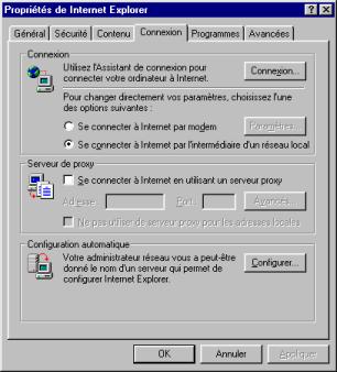 La boîte de dialogue ci-dessous indique la configuration à adopter pour Internet Explorer 4.0 sous Windows 95/98 (dans le menu Affichage/Options, onglet Connexion).
