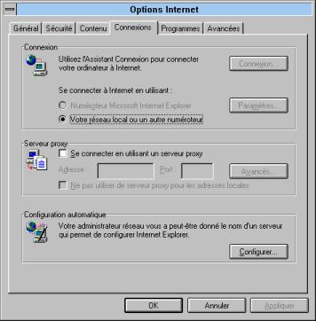 La boîte ci-dessous illustre la configuration d'Internet Explorer 5.0 sous Windows for Workgroups (dans le menu Outils/Options Internet, onglet Connexion).