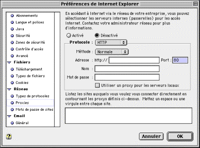 La boîte ci-dessous illustre la configuration d'Internet Explorer 4.5 sous MacIntosh OS 8.5 (dans le menu Edition/Préférences, rubrique Réseau/Proxies).